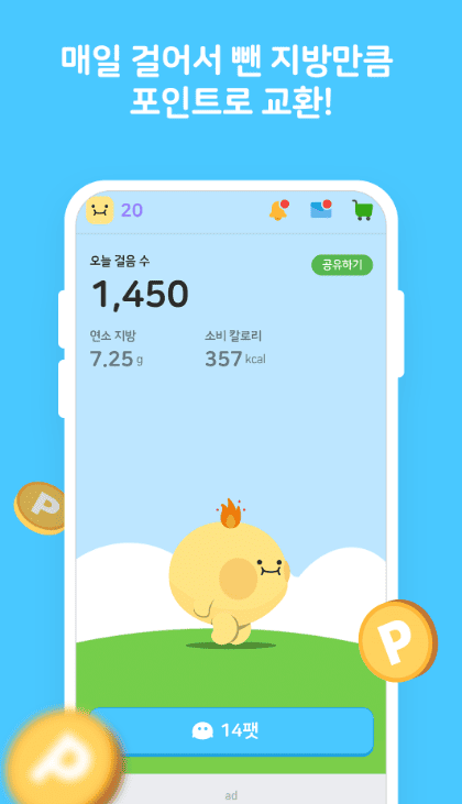 1.소모한 지방을 직접 포인트로 전환: 단순 걸음 수가 아닌 칼로리 소모량을 기반으로 연소된 지방(g)을 계산하고 이를 포인트로 보상하여 다이어트를 하는 사용자에게 최고의 동기부여를 제공합니다.
