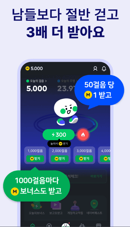 3.걷는 재미를 더하는 보너스 포인트: 5천 걸음을 넘어서면 1만 걸음까지 1천 걸음마다 랜덤 보너스 포인트를 추가로 지급하여 사용자에게 더 많이 걷고 싶게 만드는 강력한 동기를 부여합니다.