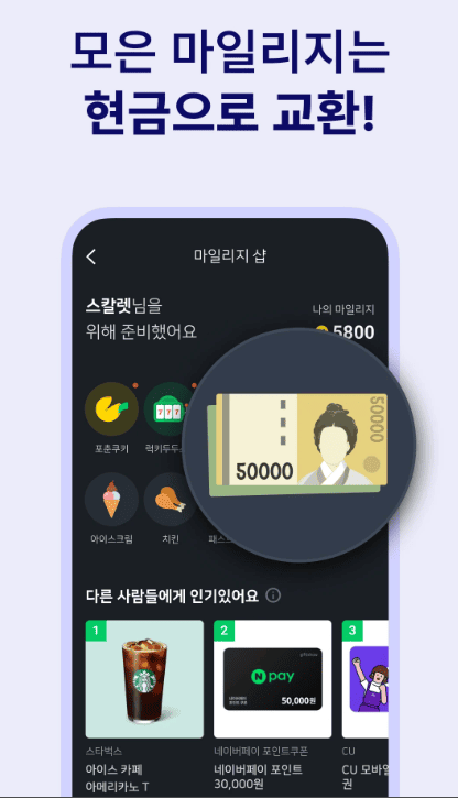 4.현금 인출과 네이버페이를 포함한 자유로운 사용: 힘들게 모은 마일리지를 계좌로 직접 송금하여 현금화할 수 있으며 네이버페이, 편의점 상품권 등 인기 기프티콘으로 즉시 교환하여 실생활에서 유용하게 사용할 수 있습니다.
