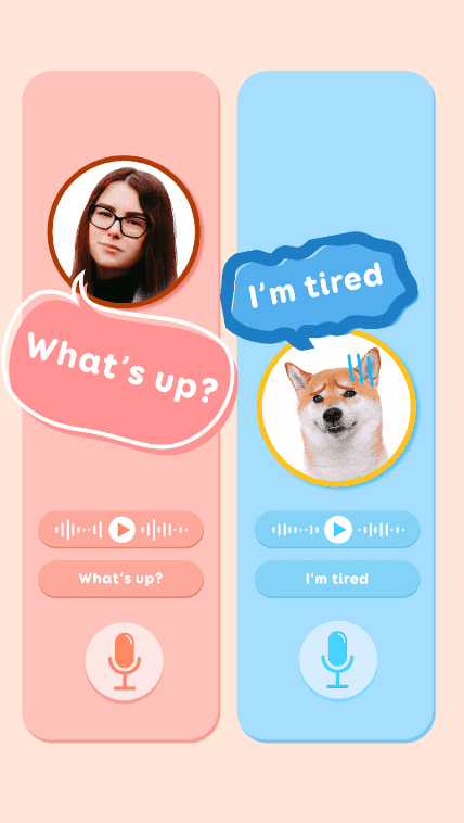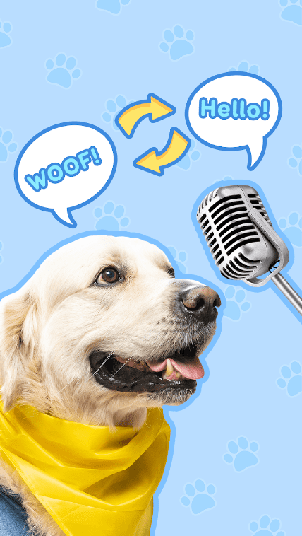 강아지 언어에서 인간으로 통역하는 문구 집을 사용하십시오. 음성을 녹음하거나 준비된 문구를 선택하십시오. 번역가는 목소리를 수정하고 다른 언어로 농담을합니다.
