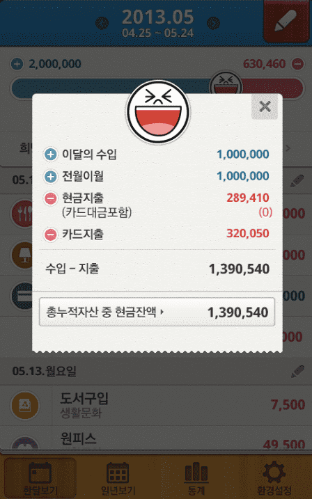 5. 자산 관리: 현금, 통장, 체크카드, 신용카드 등 다양한 자산을 세부적으로 관리할 수 있습니다.
